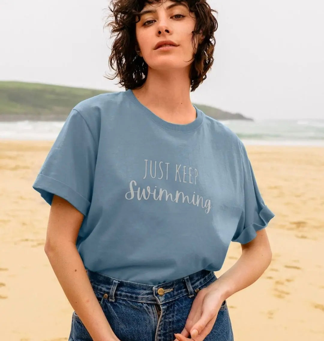 The 'Just Keep Swimming' organic cotton t-shirt is perfect for wearing to your favourite swim spot, exploring the countryside and coasts and sharing your love of the water.