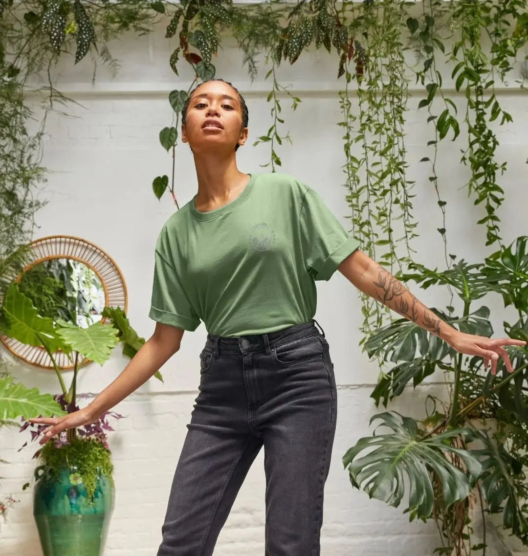 Certified organic cotton relaxed fit t-shirt, 155 gsm. Features side split and rolled sleeves. Wash cool, hang dry. GM-free. Not tested on animals. Does not contain animal-derived products. Material made in a renewable energy-powered factory, audited for a wide range of social and sustainability criteria.