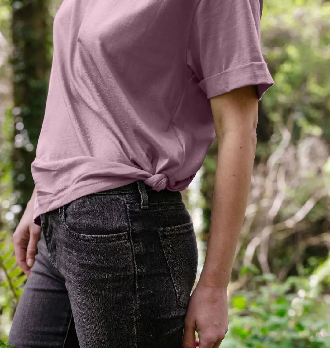Certified organic cotton relaxed fit t-shirt, 155 gsm. Features side split and rolled sleeves. Wash cool, hang dry. GM-free. Not tested on animals. Does not contain animal-derived products. Material made in a renewable energy-powered factory, audited for a wide range of social and sustainability criteria.