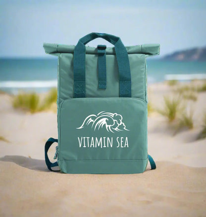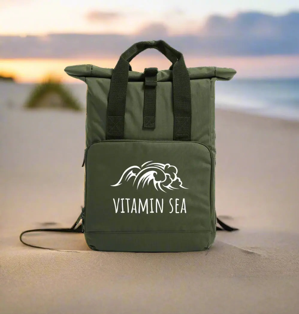Introducing the Vitamin Sea Roll-top Backpack – the perfect companion for those who can’t get enough of the ocean. This durable, water-resistant backpack features a spacious roll-top design, offering ample storage for all your beach essentials, gear, and more. Whether you're hitting the waves, hiking coastal trails, or just soaking in the seaside vibes, this backpack keeps your belongings safe and organized. With its ocean-inspired design, it’s a reminder to embrace the rejuvenating power of the sea wherever your adventures take you. Stay refreshed and ready for your next coastal journey with a backpack made for the sea lover at heart.